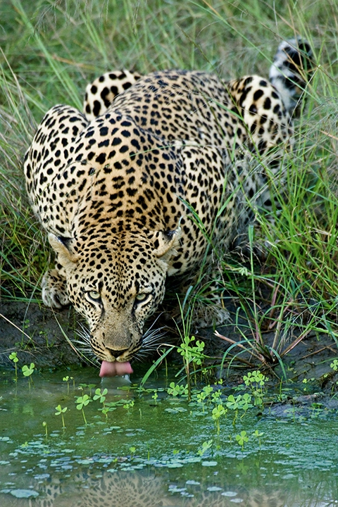 Vibrant and full of life, Thirsty Leopard captures the rare beauty of a quiet moment in the wild through the lens of wildlife photographer Paul Renner. A golden leopard pauses at the river’s edge to drink, its reflection mingling with the vivid greens of the grassy bank to create a stunning display of color and contrast. The warm tones of the cat’s coat shimmer against the cool hues of the water, producing a composition that feels both peaceful and dynamic. Printed on sleek, high-definition aluminum, every detail is brought to life with striking clarity — a breathtaking statement piece for any wildlife art collection.